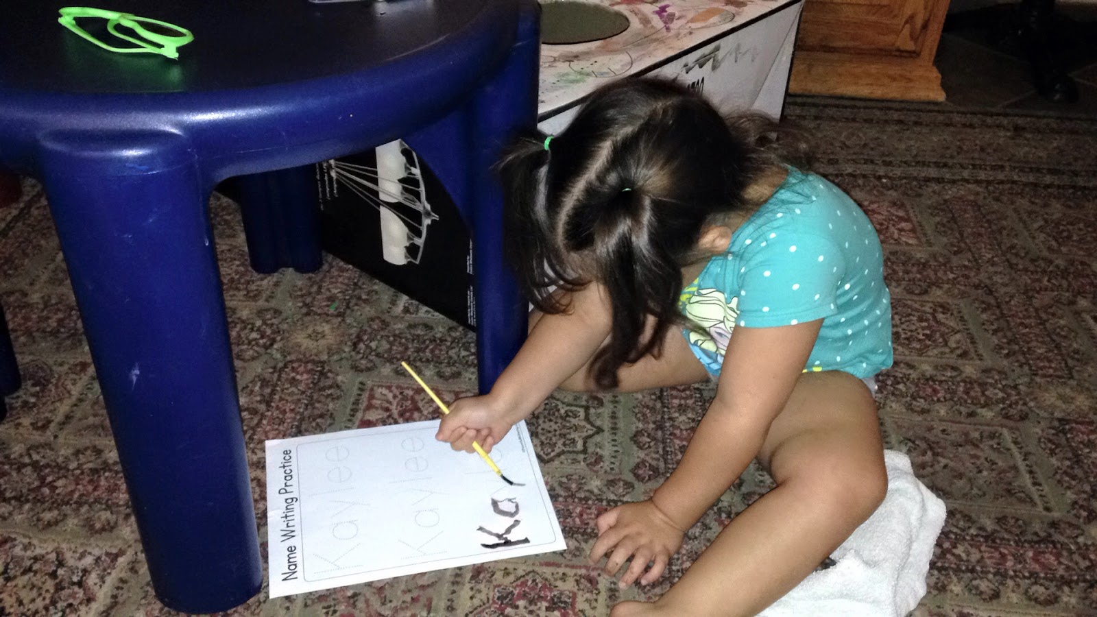 Monday, she made and Ice Cream I and did some watercoloring. She also watercolored her name (following dots)